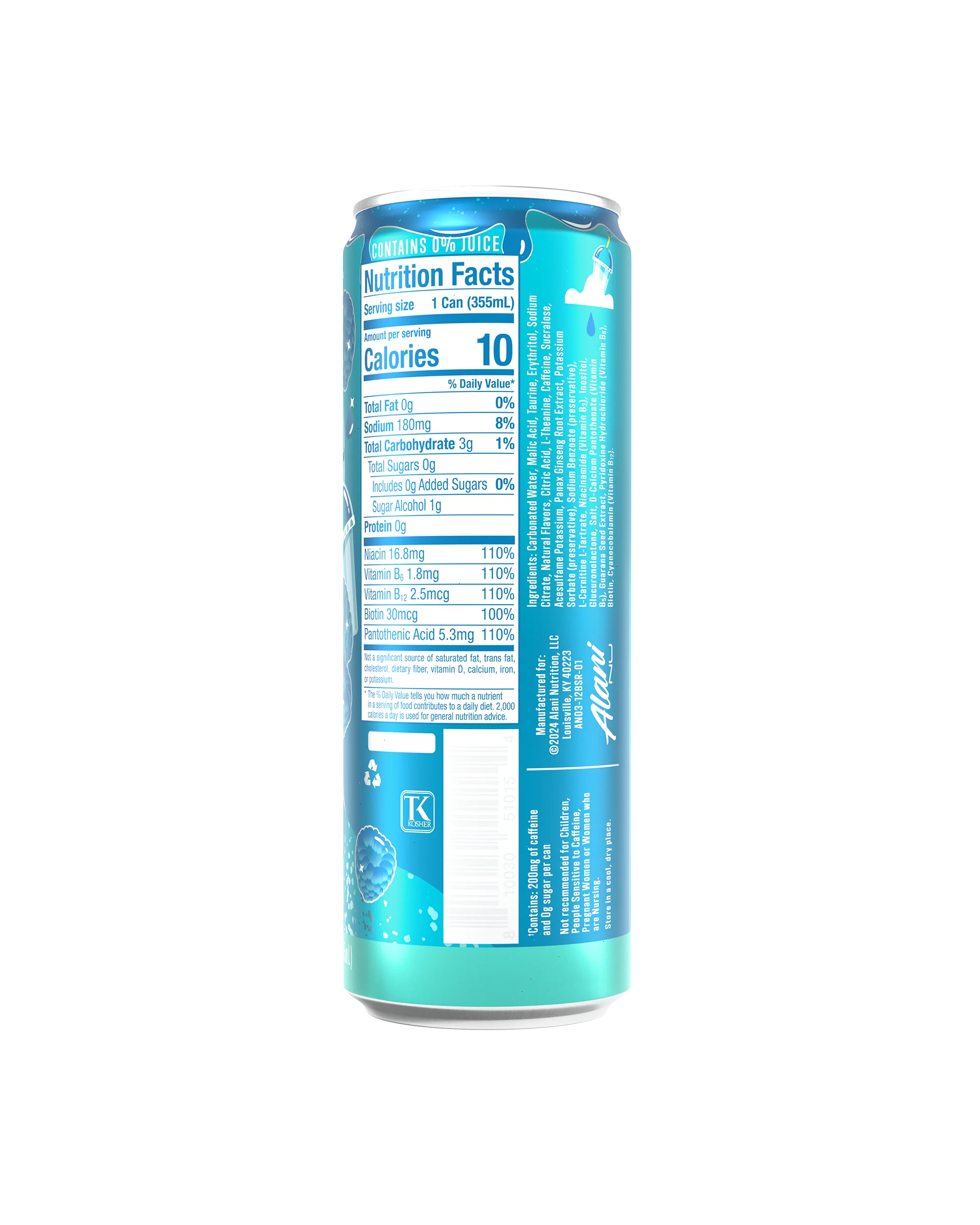 | Ingredients: Carbonated Water, Malic Acid, Taurine, Erythritol, Sodium Citrate, Natural Flavors, Citric Acid, L-Theanine, Caffeine, Sucralose, Acesulfame Potassium, Panax Ginseng Root Extract, Potassium Sorbate (preservative), Sodium Benzoate (preservative), L-Carnitine L-Tartrate, Niacinamide (Vitamin B₃), Inositol, Glucuronolactone, Salt, D-Calcium Pantothenate (Vitamin B₅), Guarana Seed Extract, Pyridoxine Hydrochloride (Vitamin B₆), Biotin, Cyanocobalamin (Vitamin B₁₂).