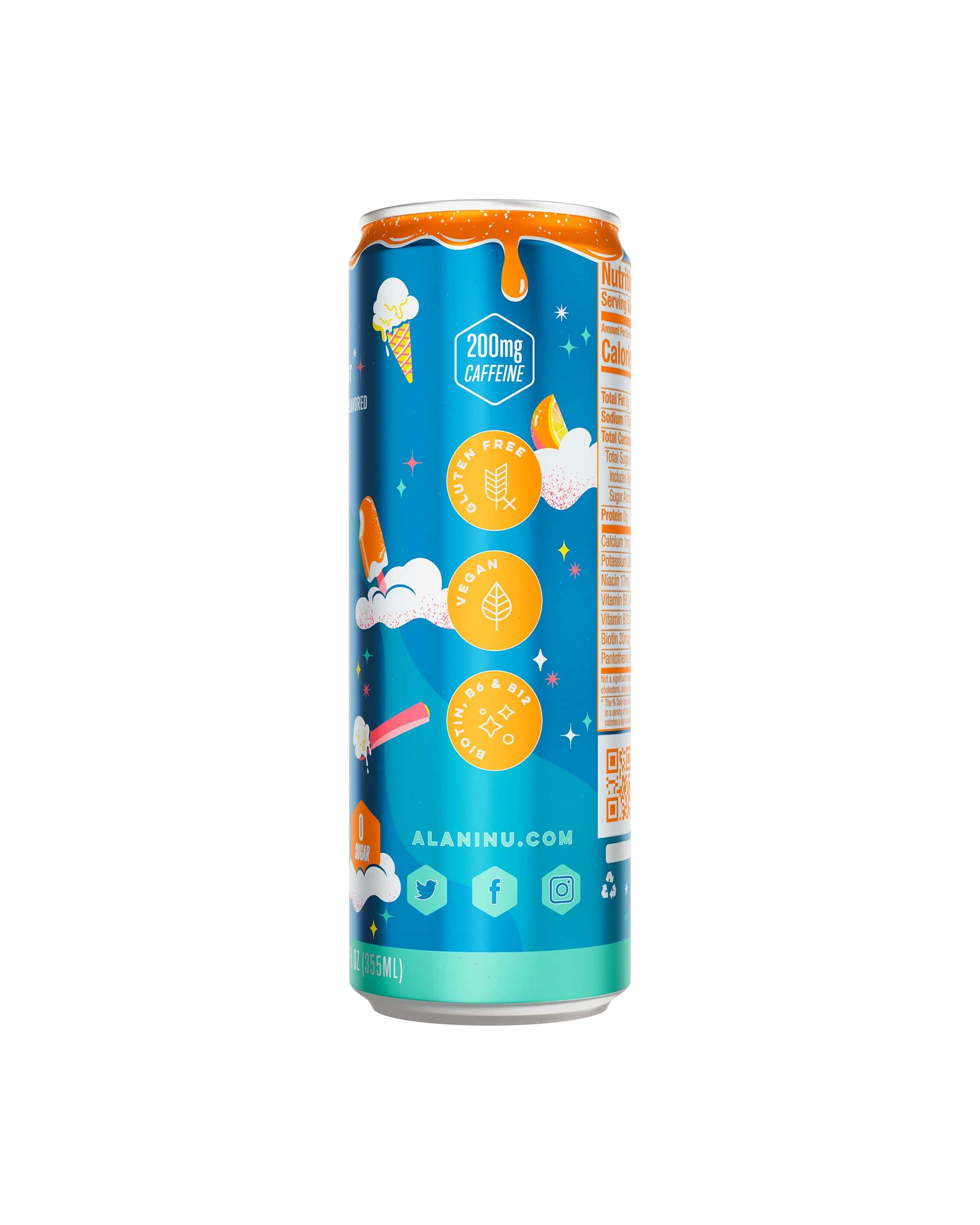 | Ingredients: Carbonated Water, Malic Acid, Taurine, Erythritol, Sodium Citrate, Natural Flavors, Citric Acid, L-Theanine, Caffeine, Sucralose, Acesulfame Potassium, Panax Ginseng Root Extract, Potassium Sorbate (preservative), Sodium Benzoate (preservative), L-Carnitine L-Tartrate, Niacinamide (Vitamin B₃), Inositol, Glucuronolactone, Salt, D-Calcium Pantothenate (Vitamin B₅), Guarana Seed Extract, Pyridoxine Hydrochloride (Vitamin B₆), Biotin, Cyanocobalamin (Vitamin B₁₂).